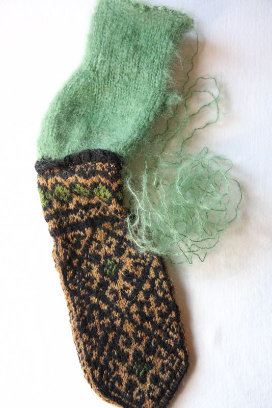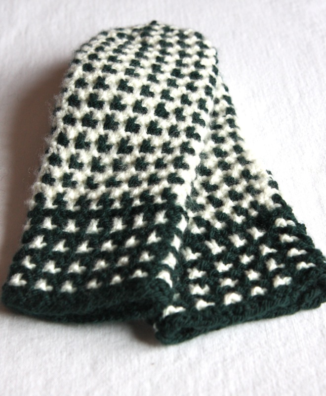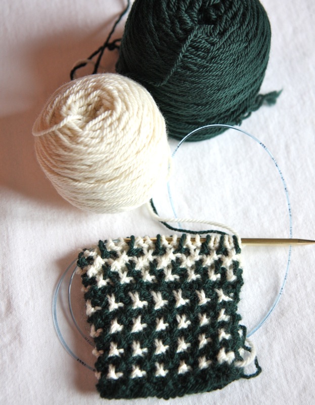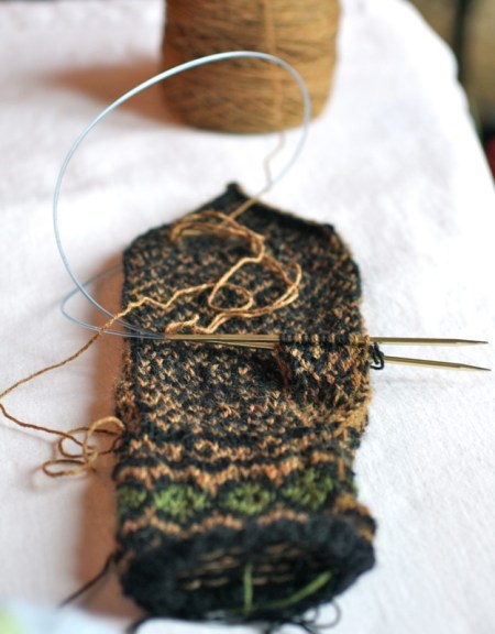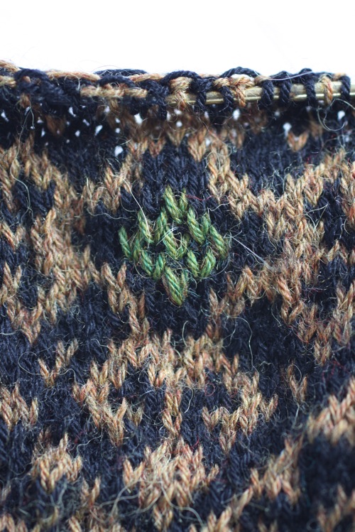 Sometimes if I want to add a little color to my knitting, but I don’t want to introduce a new yarn just for a few stitches, I will use duplicate stitch when the knitting is finished to add the color. It’s easy and quick and your little bits of color actually show up better, I think, than when they are knitted in. I’m using this technique on the Andalus Mittens that I am knitting right now.