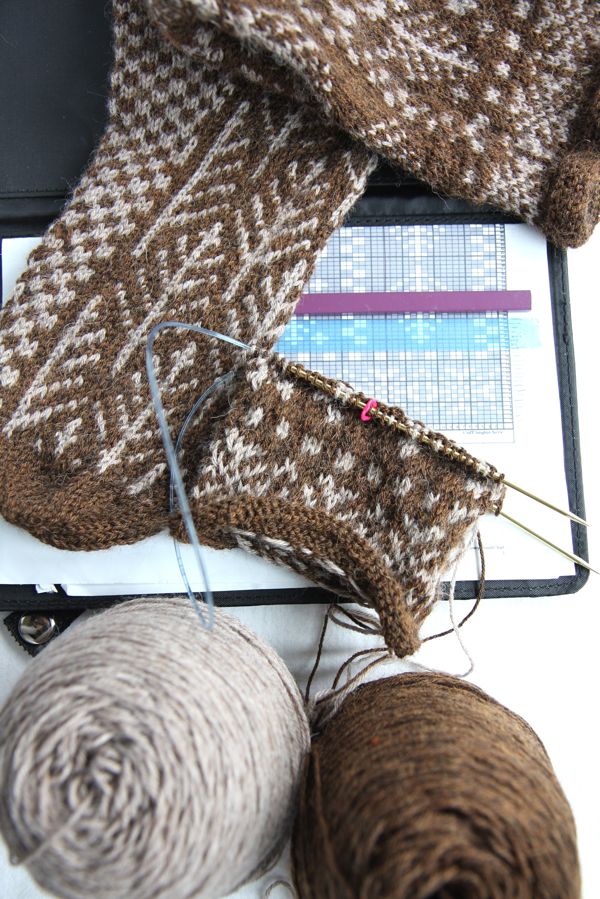 Barbara, who teaches that sock class at Rae’s, really prefers an afterthought heel, placing waste yarn as you knit, which is easily picked out later for the heel. Having done socks with both a gusset/heel flap and the afterthought technique, I’ve come to prefer the afterthought heel, too. It’s by far the simplest method, requiring no pattern or keeping track of short rows and Barbara feels it’s the most comfortable to wear.