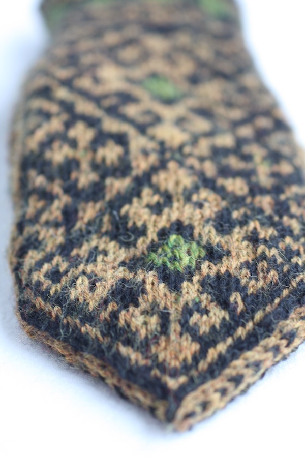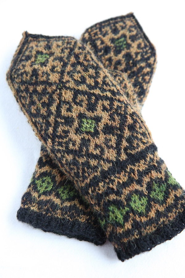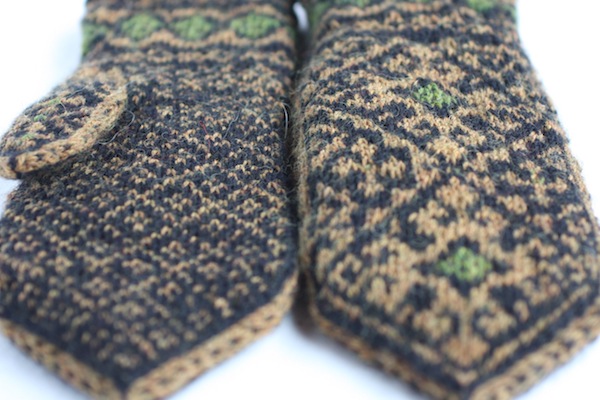 I wanted to add some green to the mittens, but instead of knitting in little stitches, I used Duplicate Stitch to add the green after the mittens were knitted. I blogged about that technique here.