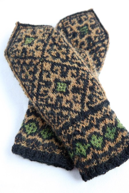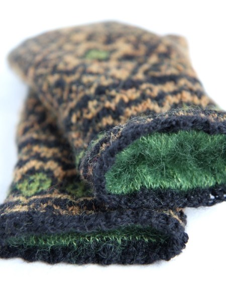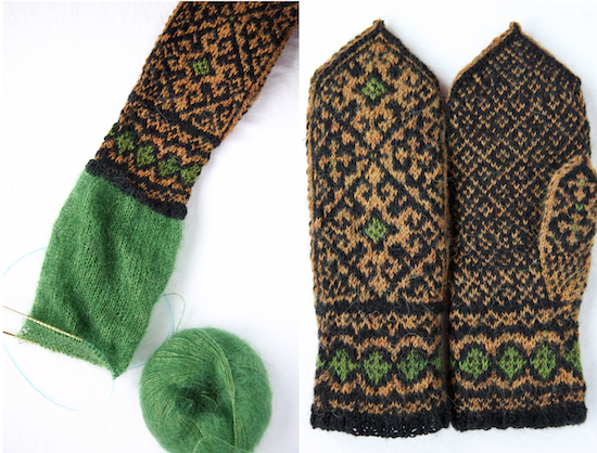 I knitted the lining for these mittens in Rowan Kidsilk Haze, color “Fern”. You can see how the lining is knit by picking up the stitches along the inside of the cuff :