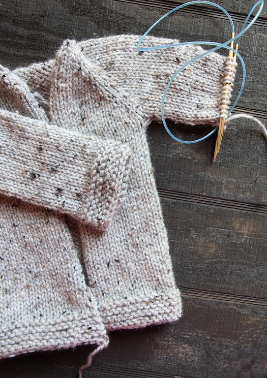 Shawl Baby Sweater and Garter Ear Flap Hat » shawl-sweater-one-sleeve-on-needle