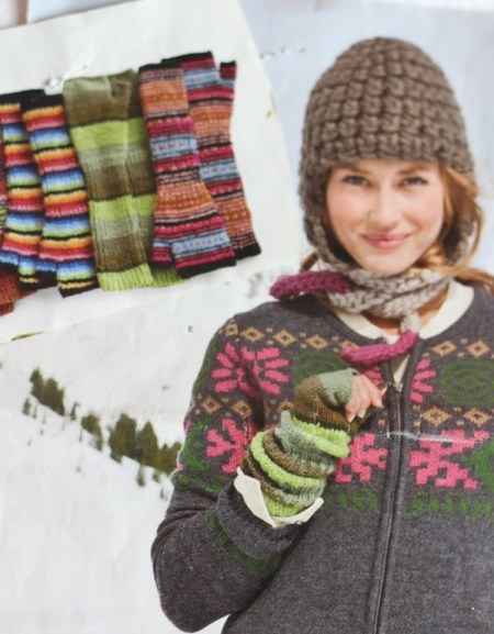 The pattern calls for these mittens to be knitted with worsted weight yarn. When I did a mitten the first time, they were way too thin and way too small. So I experimented and knitted another mitten with the same worsted weight yarn, only held double and they were perfect! As I was knitting the piece, it looked huge, but after it was seamed together, it was just right. It makes a double thick, warm mitten this way and the cuff comes up a full 3.5 inches on my wrist. They’re a nice size.