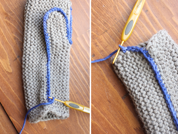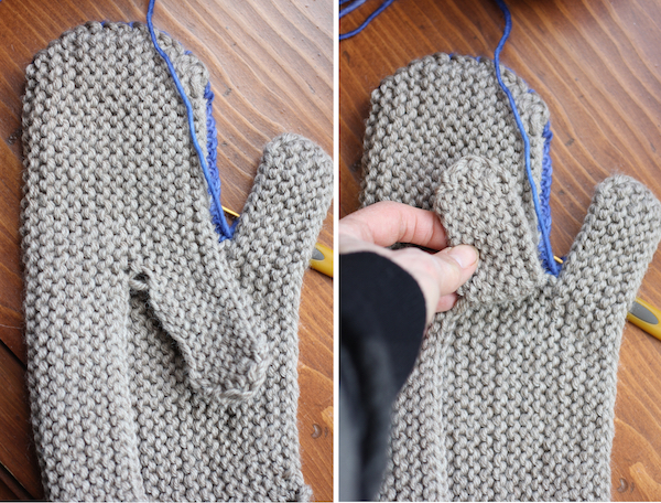 crochet down the thumb, the lower side seam and then just continue right around the cuff.