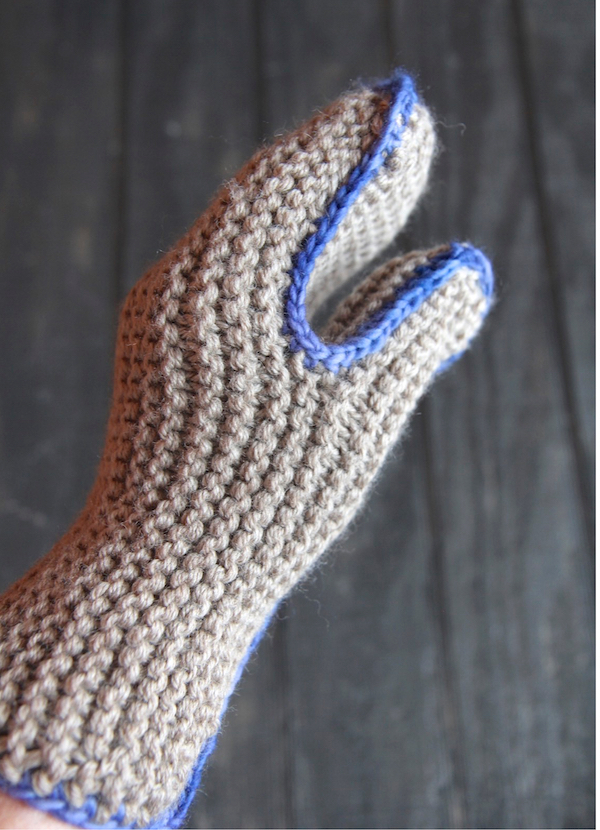 then fold over the thumb on the right to match the thumb on the left and continue to single crochet them together (above)